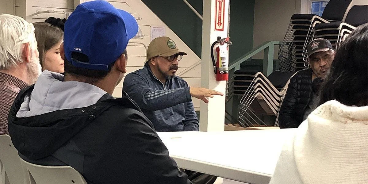 Image above: Ubaldo Hernández (center) facilitates discussion between residents organizing against their eviction from the Washington Street Mobile Home Lot and White Salmon City Officials.